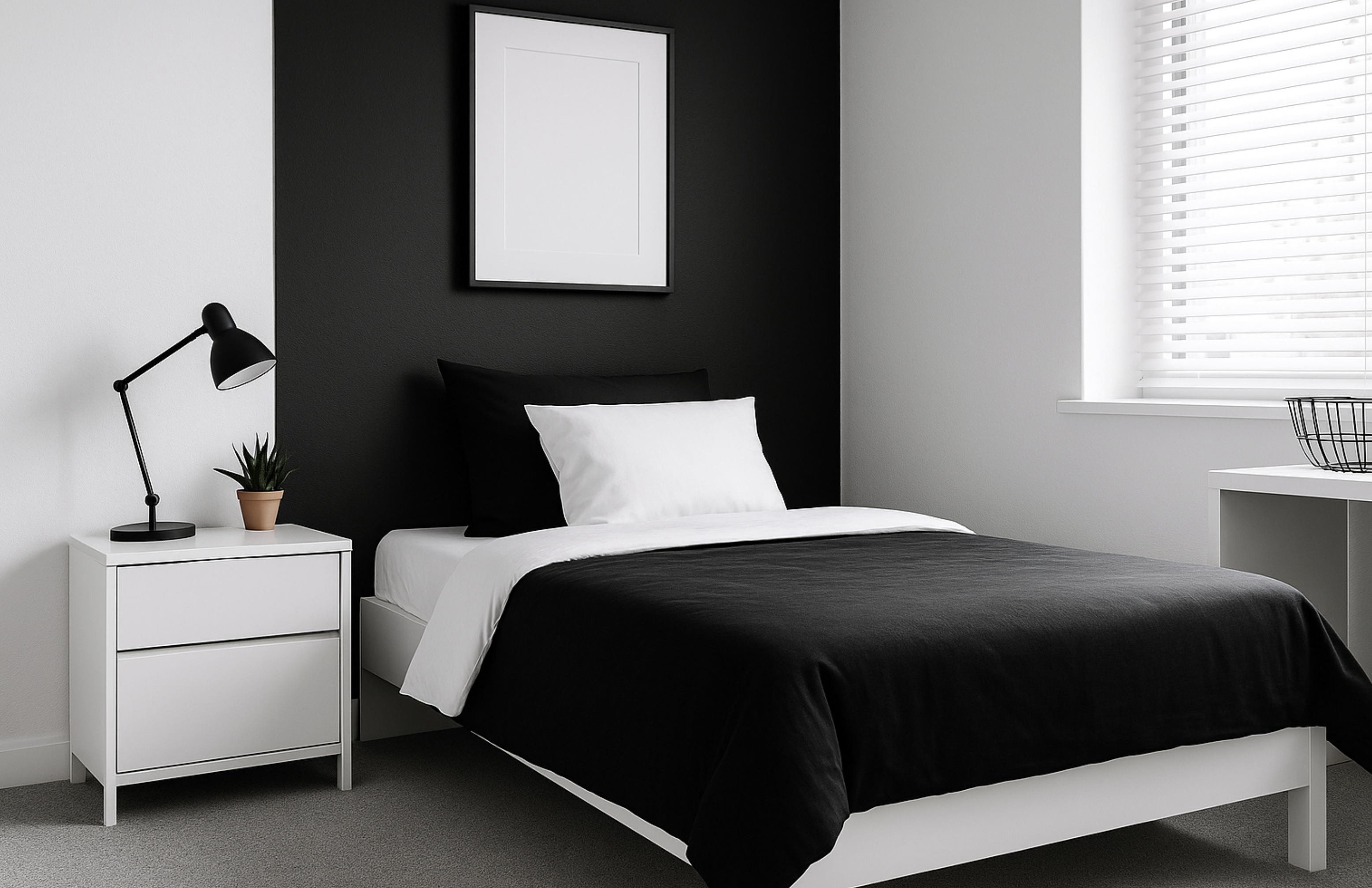 Łóżko stanowi centralny punkt czarno-białej aranżacji – proste, o białej ramie i czarnej narzucie, idealnie wpisuje się w minimalistyczny klimat wnętrza. Kontrast czerni i bieli podkreśla nowoczesny charakter pokoju, a starannie dobrane dodatki – takie jak geometryczne poduszki, subtelne oświetlenie LED i matowe wykończenia – sprawiają, że przestrzeń wygląda elegancko, ale jednocześnie przytulnie.