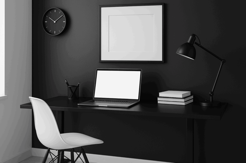 Czarne biurko o prostym, matowym blacie stoi na tle równie ciemnej ściany, tworząc efekt nowoczesnej, surowej elegancji. Całość przełamują białe elementy, które wprowadzają kontrast i porządek w kompozycji. Minimalizm formy i spójna kolorystyka sprawiają, że przestrzeń wygląda estetycznie i funkcjonalnie, bez zbędnych ozdób. To przykład, jak prostota i konsekwencja w użyciu barw mogą stworzyć wnętrze o wyrazistym, młodzieżowym charakterze.