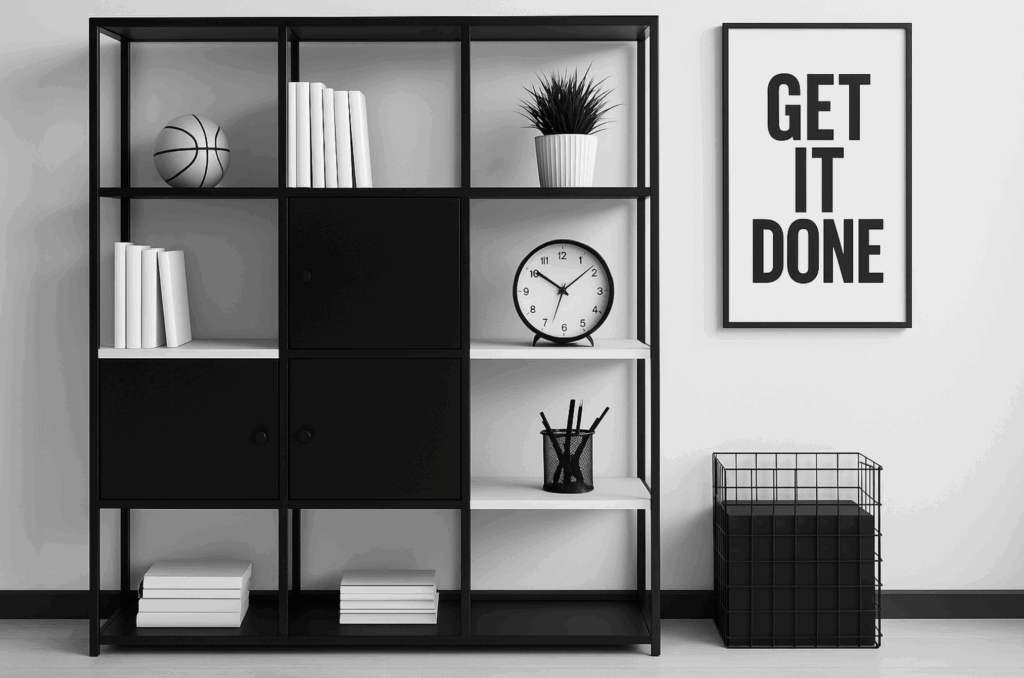 Nowoczesne regały w czarno-białym pokoju młodzieżowym łączą funkcjonalność z estetyką. Otwarte półki pozwalają na wyeksponowanie książek, roślin i dekoracji, dzięki czemu wnętrze zyskuje lekkość i indywidualny charakter. Z kolei zamykane fronty w czerni wprowadzają rytm, porządek i subtelny kontrast wobec jasnych elementów pomieszczenia. Całość prezentuje się spójnie i nowocześnie – to rozwiązanie, które nie tylko dobrze wygląda, ale też pomaga utrzymać wizualny ład w przestrzeni młodej osoby.