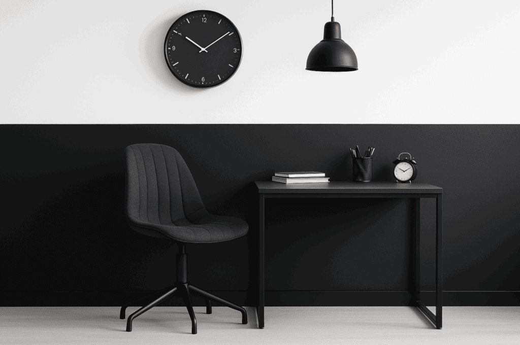Krzesło w czarno-białym pokoju młodzieżowym powinno łączyć wygodę z nowoczesnym stylem. Na wizualizacji widać model obrotowy z miękkim siedziskiem i ergonomicznie wyprofilowanym oparciem, idealnym do nauki lub pracy przy komputerze. Czarne wykończenia świetnie komponują się z industrialnym biurkiem i minimalistycznym tłem, tworząc spójną, przemyślaną aranżację. Subtelne dodatki – zegar ścienny i lampa w stylu loft – podkreślają nowoczesny charakter wnętrza, nie przytłaczając go nadmiarem detali.