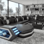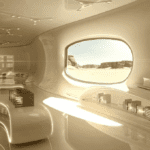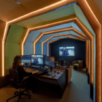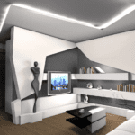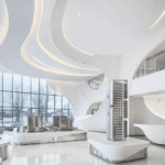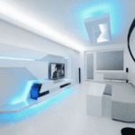 Listwy LED i podświetlenia liniowe eksponują krzywizny i geometryczne kształty, tworząc efekt „świecącej architektury” rodem z wizji przyszłości.