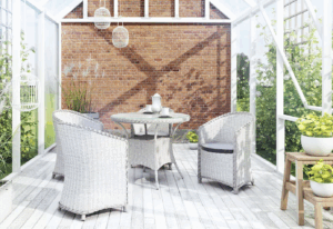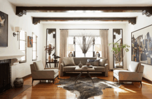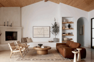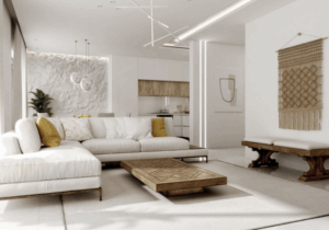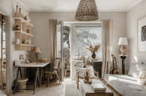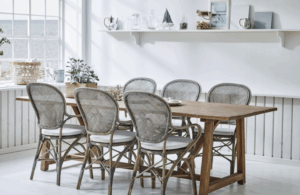 Jesli chodzi o meble, dominują drewno, rattan, wiklina i żelazo, często w jasnych, ciepłych odcieniach lub delikatnie postarzane. Charakterystyczne są zaokrąglone kształty, wygięte nóżki i ażurowe detale, które dodają wnętrzu przytulności i lekkości. Niskie, masywne stoły, wygodne sofy i fotele z miękkimi poduchami, zapraszają do odpoczynku. Najważniejsze jest, by meble nie przytłaczały przestrzeni, lecz współgrały z otoczeniem i podkreślały beztroski, wręcz wakacyjny klimat domu.